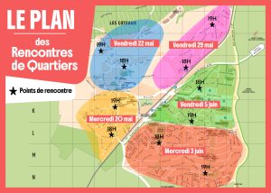 Concertation, dialogue, information, écoute. À partir du mercredi 20 mai, les élus du Conseil municipal vont se rendre dans vos quartiers pour échanger avec vous et maintenir un dialogue constructif. Venez à leur rencontre, de 18h à 20h. Remarques, besoins, demandes à faire remonter… Le maire, ses adjoints et les conseillers municipaux évoqueront également les projets de demain.