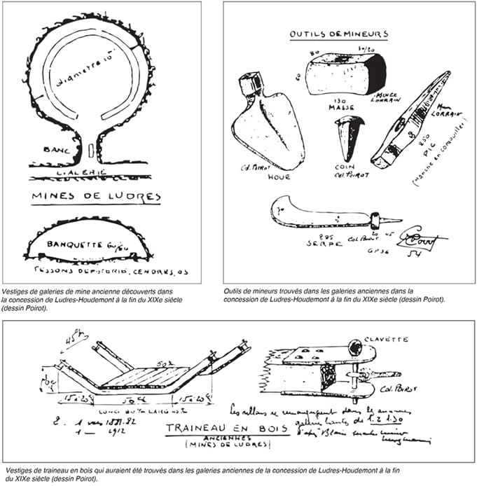 Lorsqu’au XIXe siècle les sociétés minières commencèrent leur exploitation, elles sont tombées sur d’anciennes galeries, très basses, qui longeaient les fissures naturelles. Lors du percement de la galerie n°1 de la Société du Nord-Est, vers 1872, les anciennes galeries furent découvertes sur une longueur de 71 mètres. Il en fut de même lors des travaux préparatoires de la galerie n°2, en 1930, où Charles Simon put pénétrer, sur une centaine de mètres, dans des galeries larges de 1,20 mètre et hautes de 0,80 à 1 mètre, percées dans la couche moyenne qui contient le minerai le plus riche en fer. Des outils (pelles, coins, masses, serpes) furent découverts à différentes époques suivant l’avancement des travaux. Le minerai était évacué sur des traineaux en bois, renforcés de plaques de fer, qui ont laissé des sillons sur le sol des galeries. Des céramiques y ont été découvertes, dont un vase complet dessiné par l’archéologue Jules Beaupré, vase attribuable à l’époque carolingienne. Ce vase appartenait donc aux mineurs qui ont approvisionné les bas fourneaux du village.